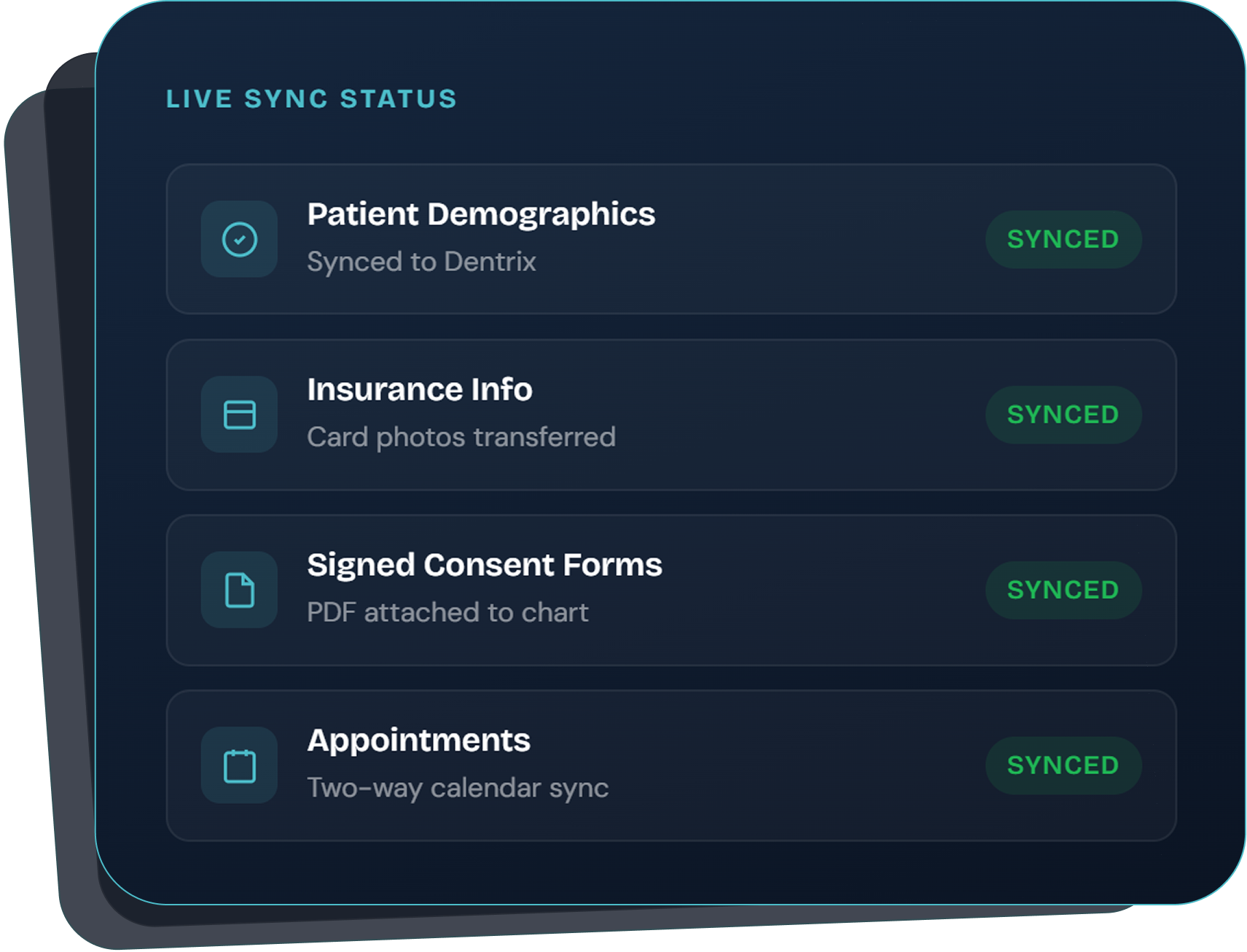 Designed to coordinate the patient data your team needs across systems, with sync scope dependent on each PMS’s integration channel.