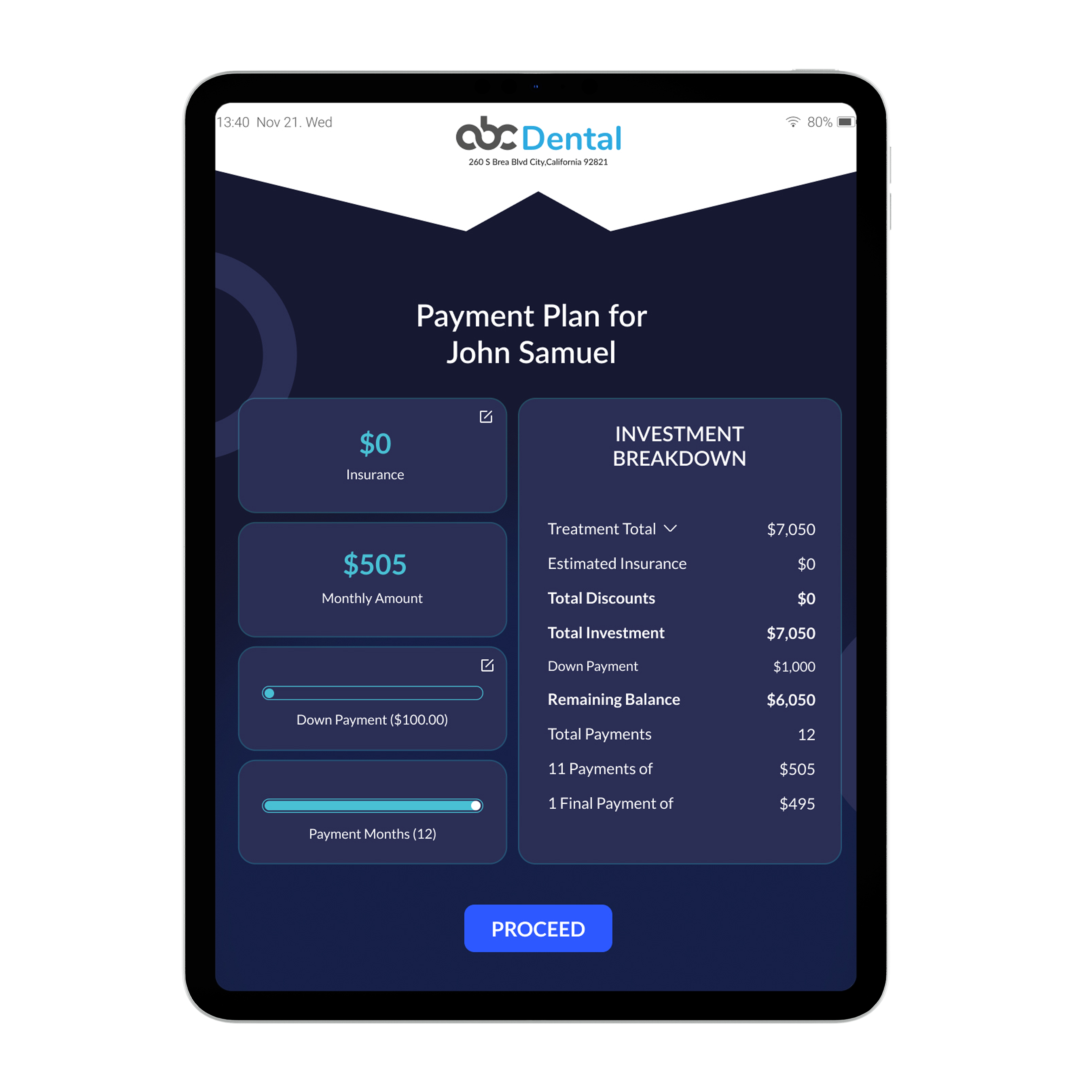 Present clear, flexible plans on your iPad. Patients see the options, approve the terms, and sign digitally—boosting acceptance and trust.