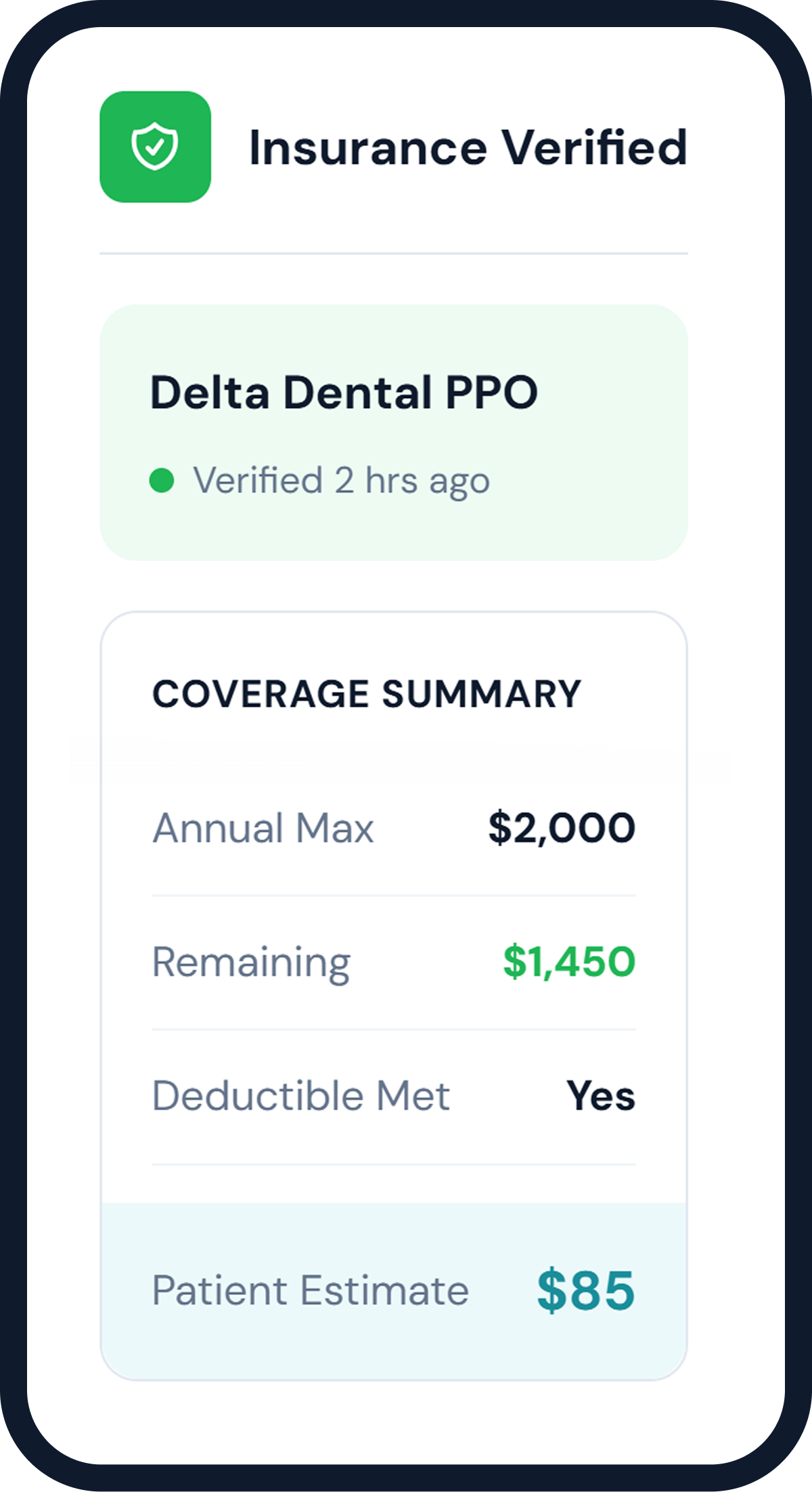 A dedicated human team verifies coverage and uploads full breakdowns directly to your PMS — before the patient arrives. No checkout surprises. No denied claims.