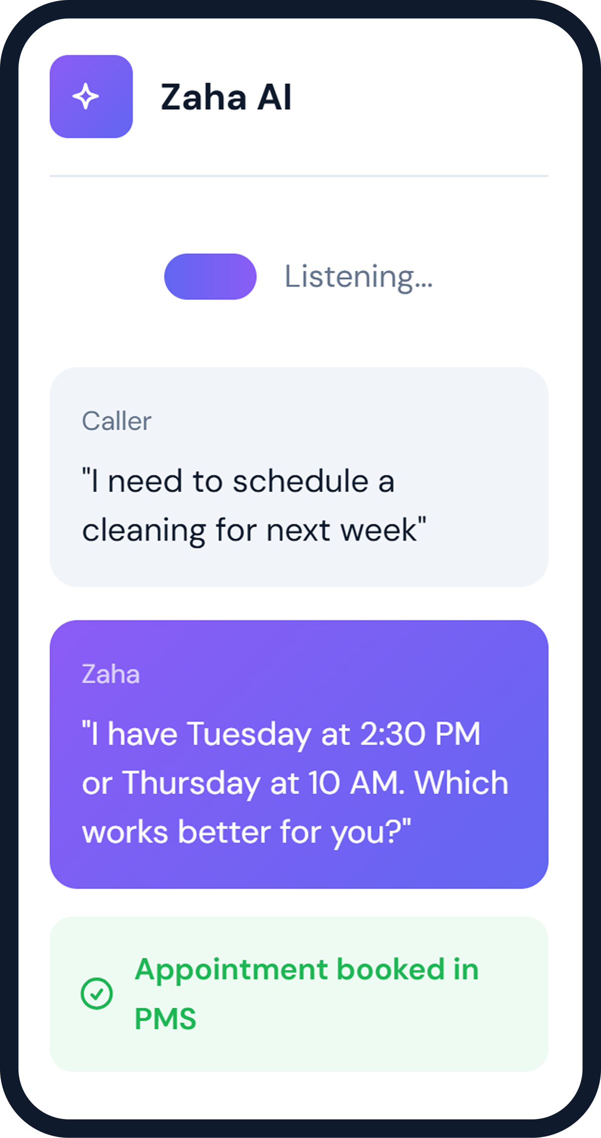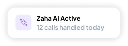 - Never miss a call — Zaha AI answers 24/7