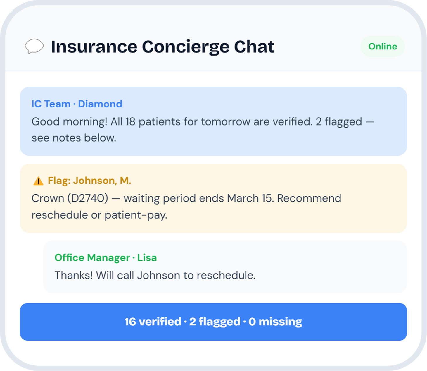 Insurance Concierge is a managed dental insurance verification service with a dedicated human team that completes eligibility and benefits verification for your patients and documents the results before appointments.