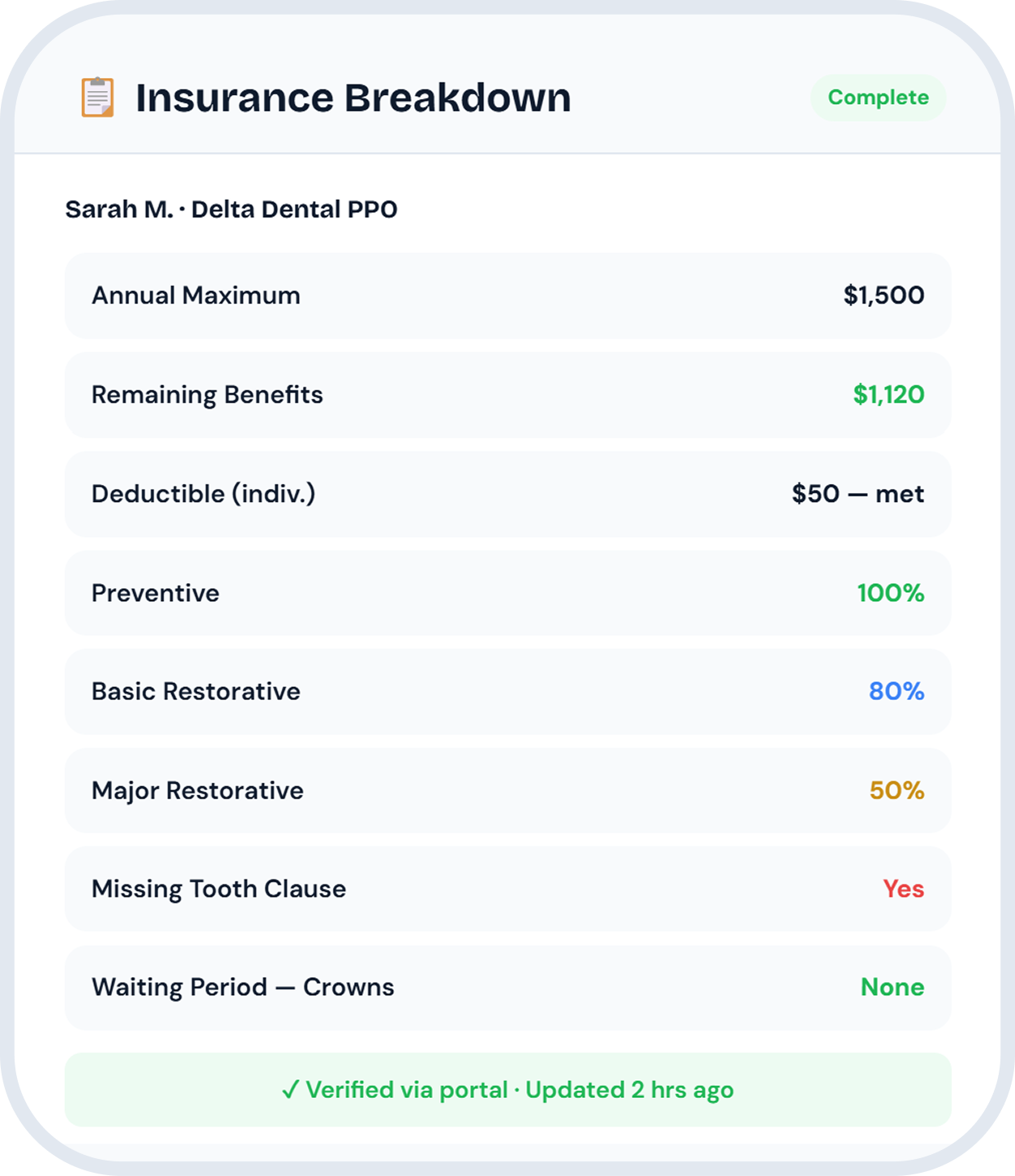 Verified breakdowns are in your PMS before the patient arrives. No surprises, no hold times, no claim denials from bad data. Your front desk focuses on care, not calls.