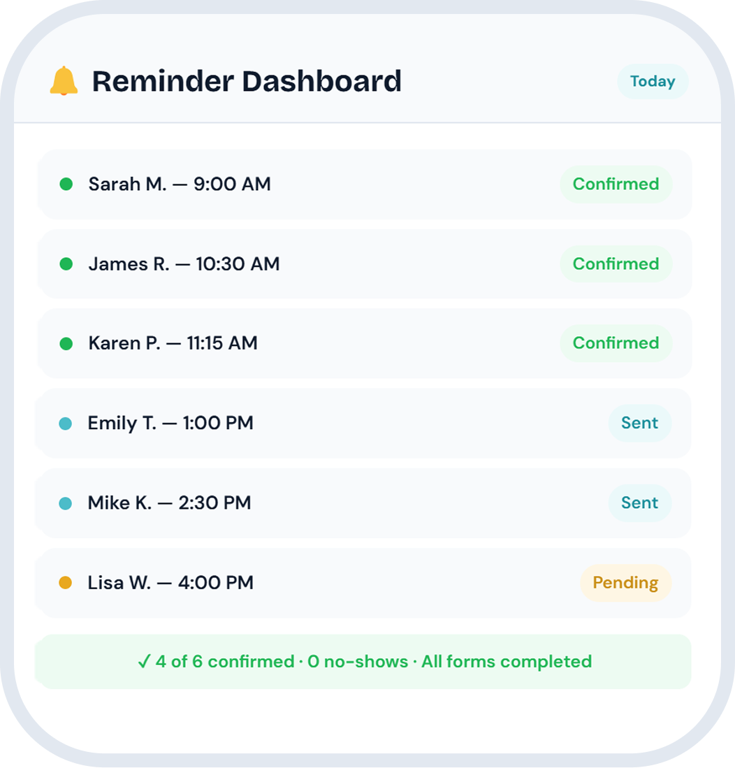 Customizable SMS and email reminders go out automatically — 7 days, 1 day, and 1 hour before every appointment. Patients confirm with a single tap, and confirmations sync directly into your PMS every 10 minutes. Send digital intake forms right alongside the reminder so patients arrive ready.
