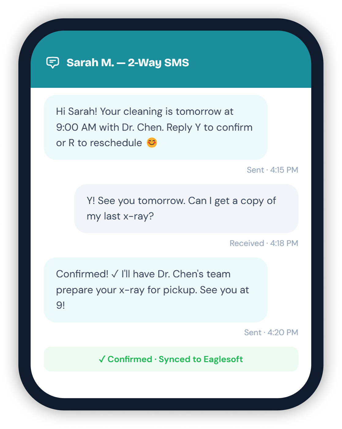 Everything your practice needs for automated patient engagement — appointment reminders, 2-way texting, Quick Fill messaging, and more. HIPAA-compliant and synced with Dentrix, Eaglesoft, and Open Dental.