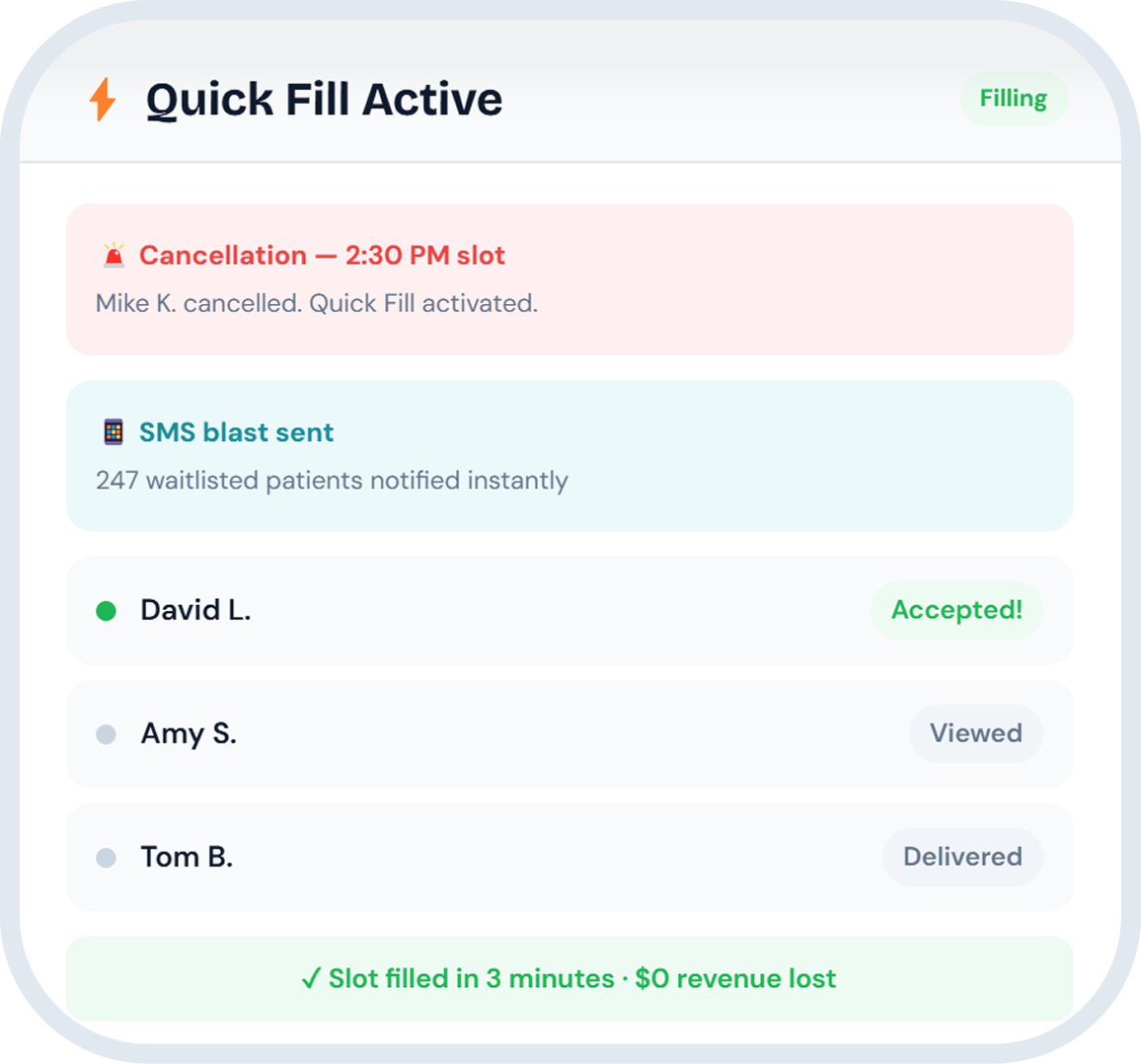 - ✓ Cancelled slots filled in under 5 minutes with Quick Fill messaging