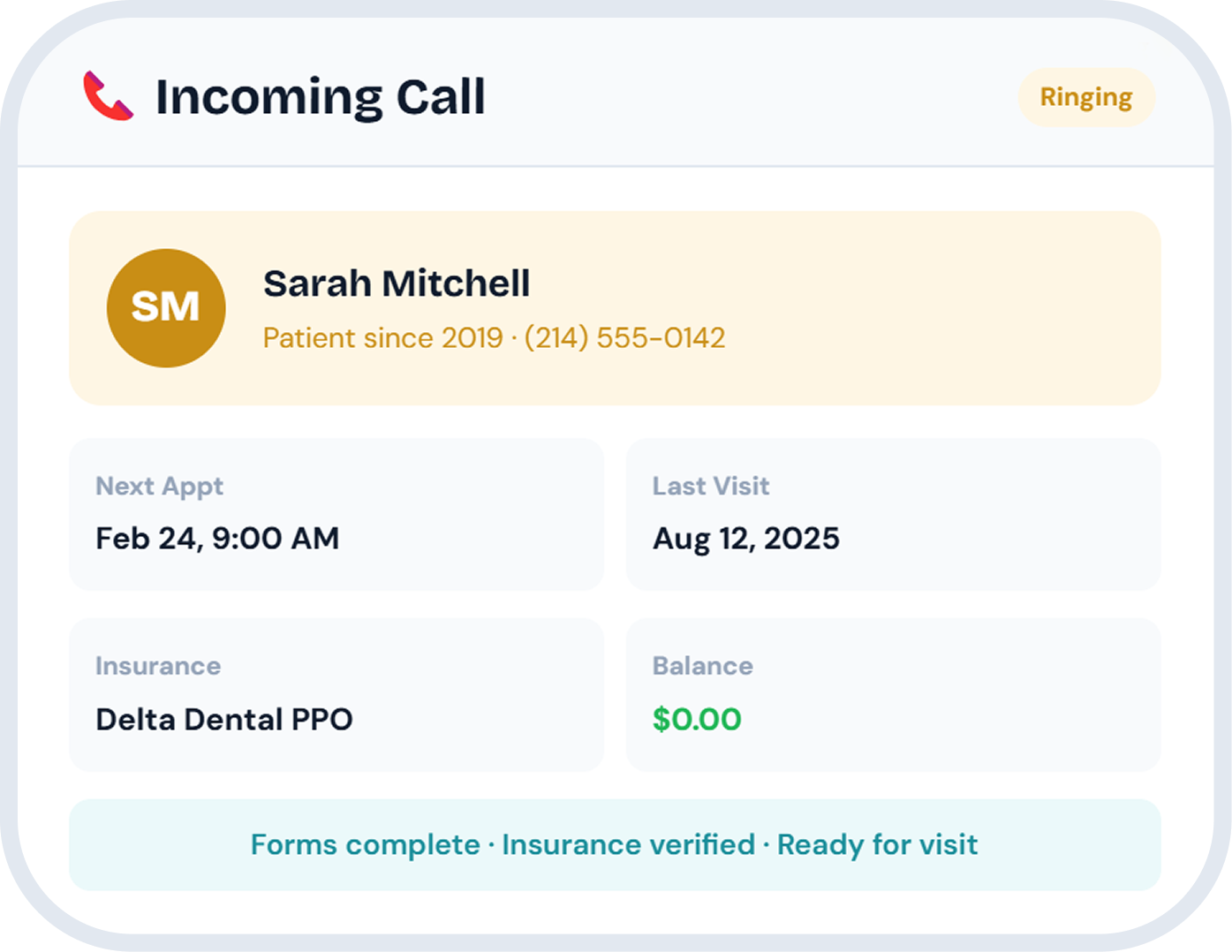 Powered by the Mango Voice partnership, Smart Phone pops up the patient's full profile the moment they call — name, upcoming appointments, insurance info, outstanding balance, and form status. Your team sounds informed and prepared on every call, building instant trust.