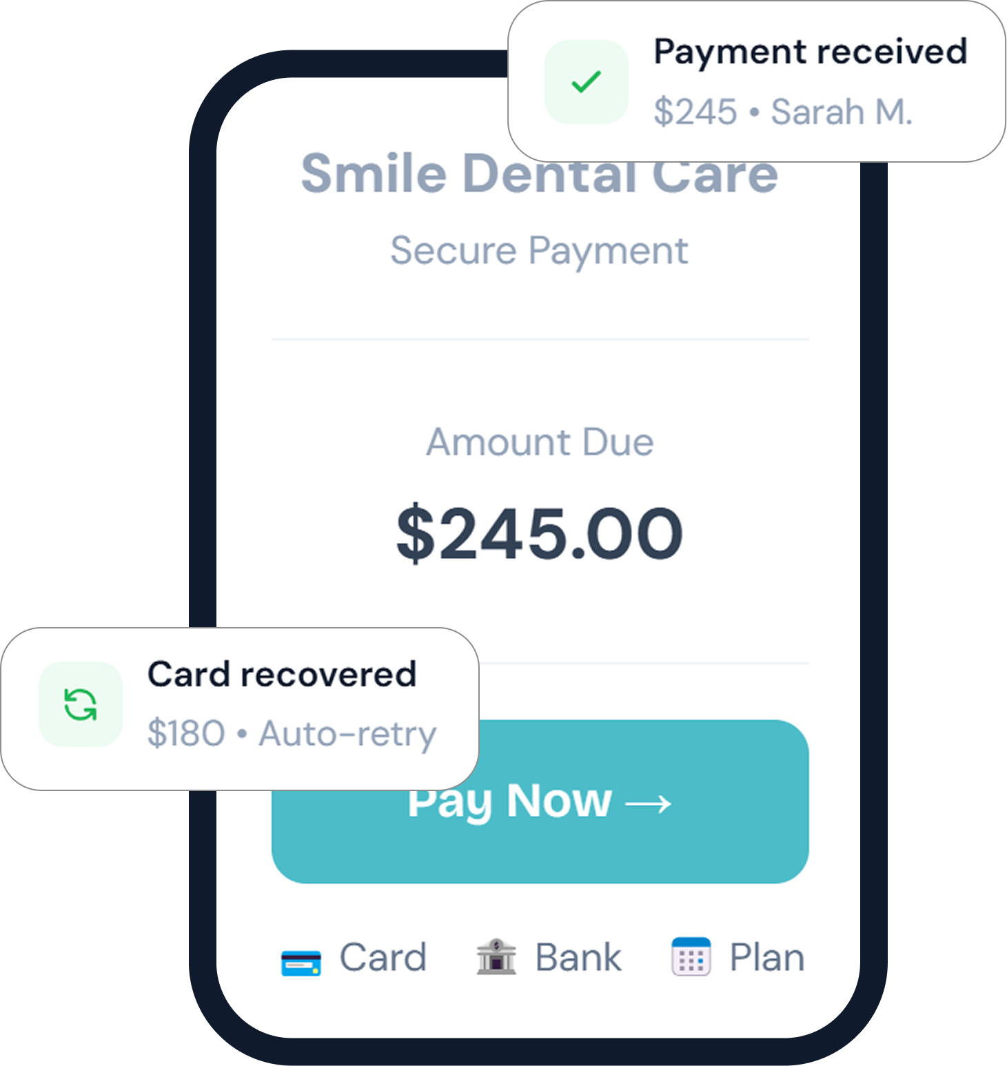 Offer flexible installment plans automatically. Patients pay on schedule, you collect more — everyone wins.