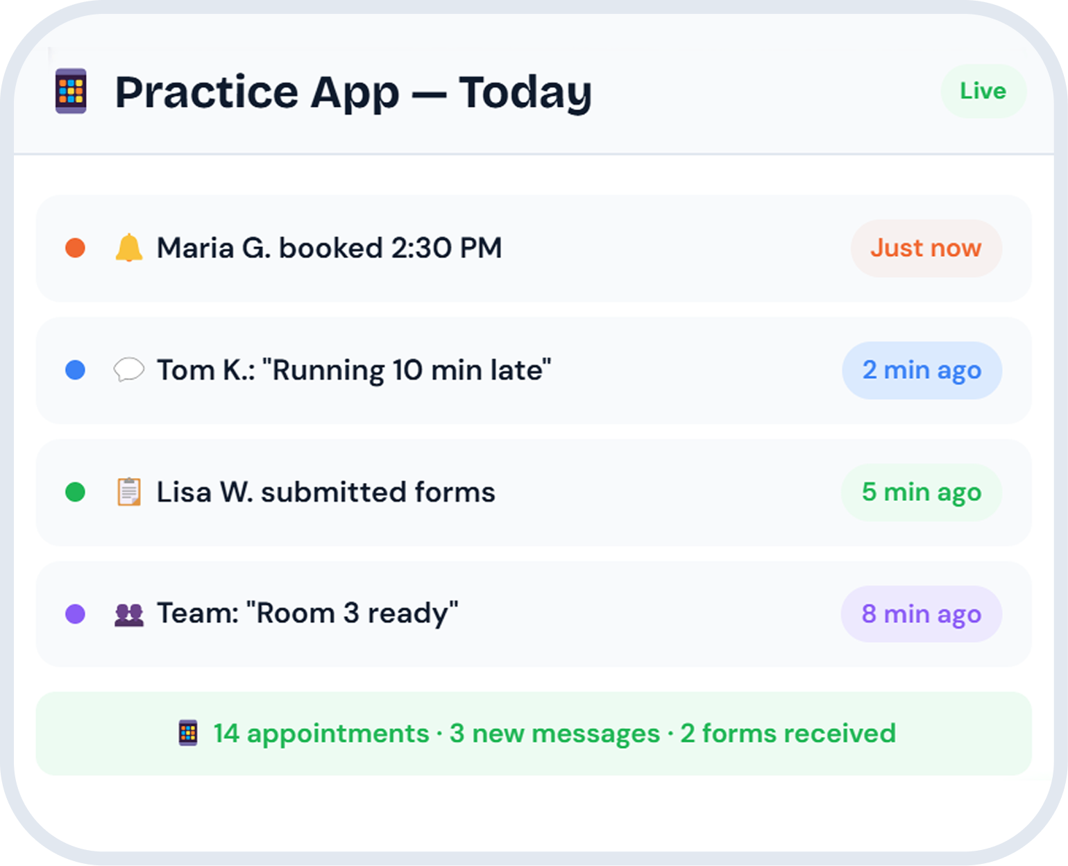 Real-time push notifications for appointments, patient messages, form submissions, and team updates. Stay connected anywhere.