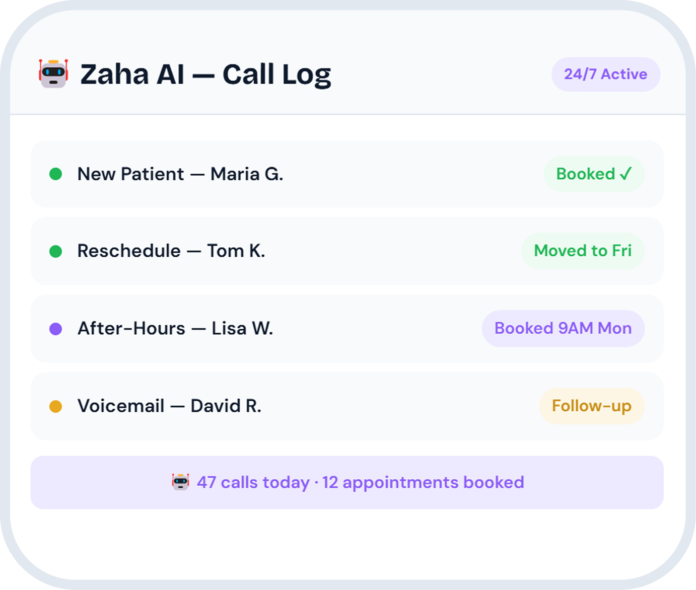 ~20% of new patient calls go unanswered. Zaha AI — mConsent's 24/7 AI receptionist — answers every call, books appointments in real time, and captures new patient leads. Even after hours, weekends, and during lunch rush.