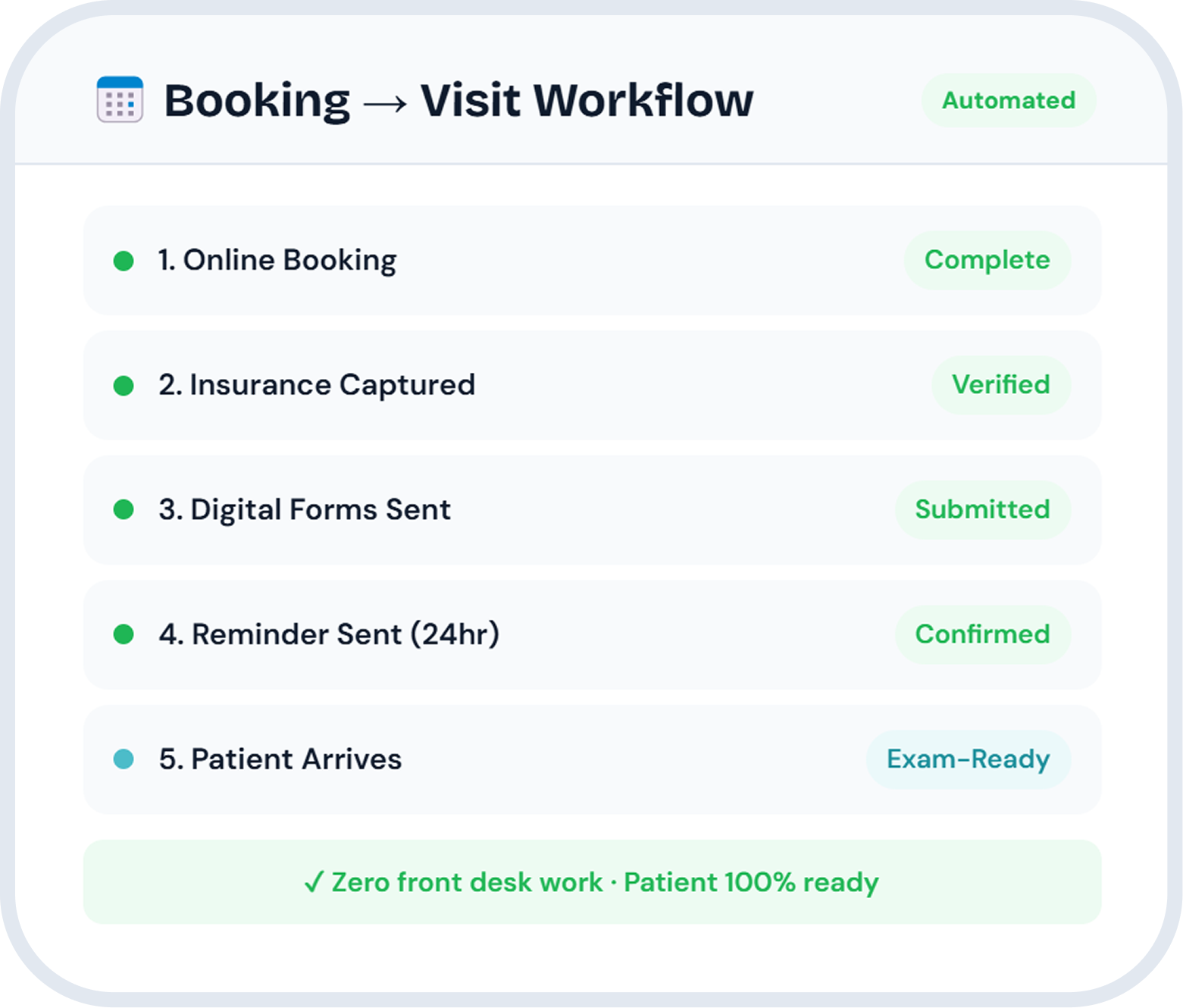 Online scheduling starts a complete intake workflow. Insurance collected, forms sent, reminders delivered — all before the patient walks in.