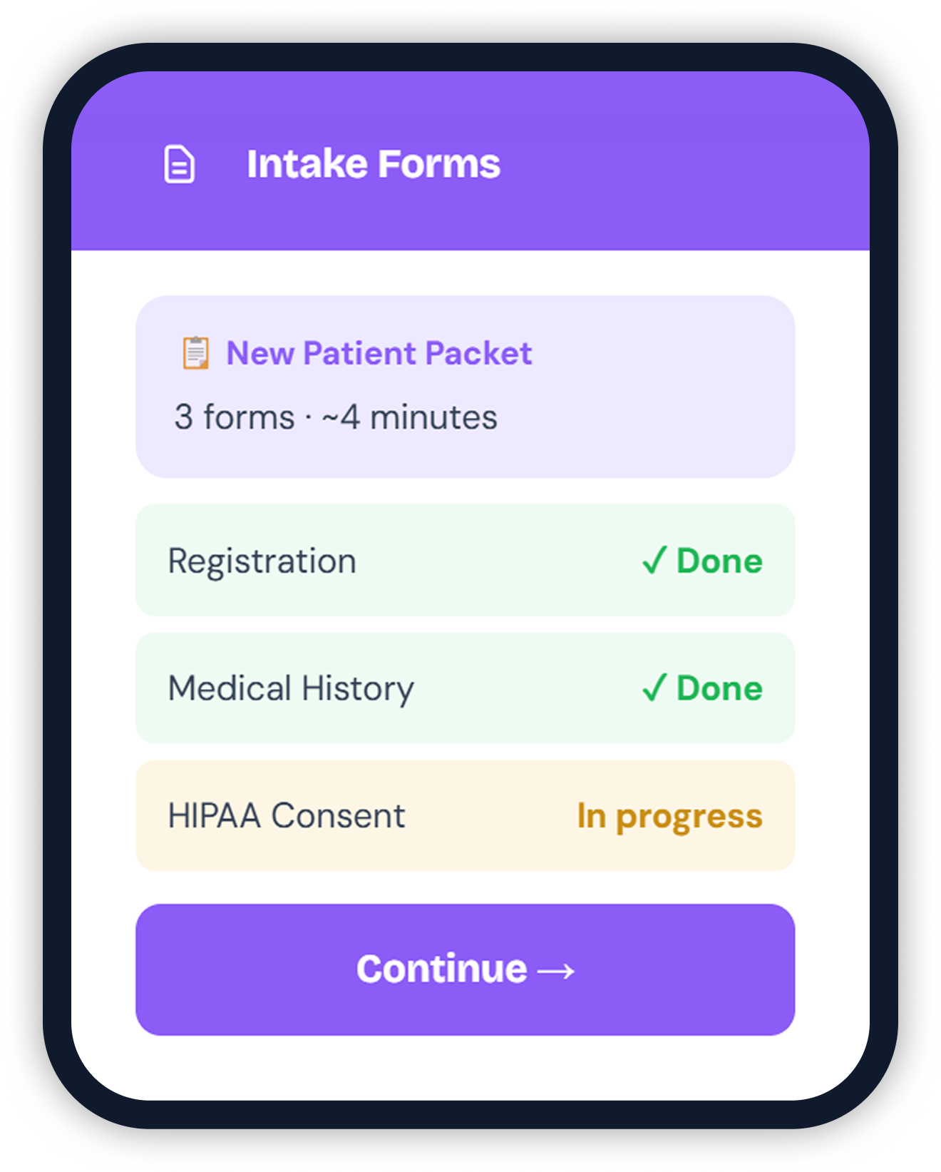 From patient notification to PMS integration — the entire paperless intake workflow runs itself.