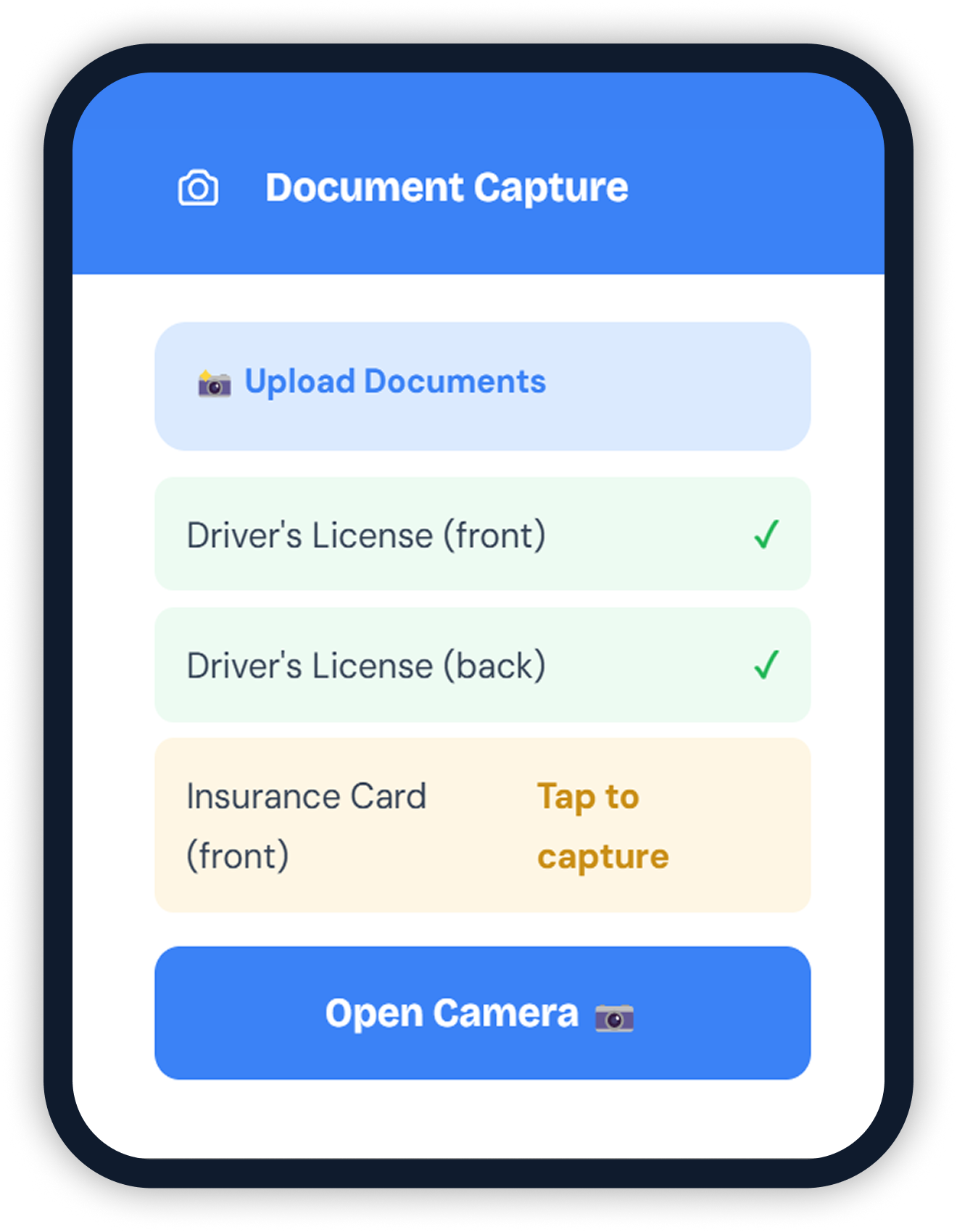 | Insurance + ID photo capture (no front-desk scanning) | ||