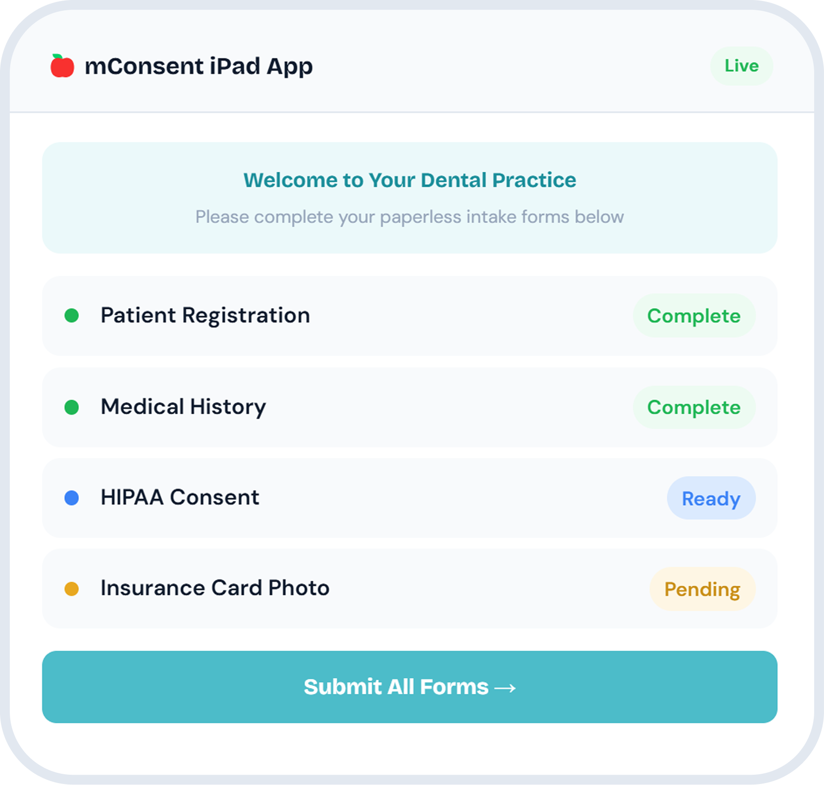 We build a personalized iPad app with your practice logo and all your digital dental forms — consent forms, registration, medical history, and more. Walk-in patients and those who didn't complete forms at home fill out everything on your custom-branded iPad at check-in.
