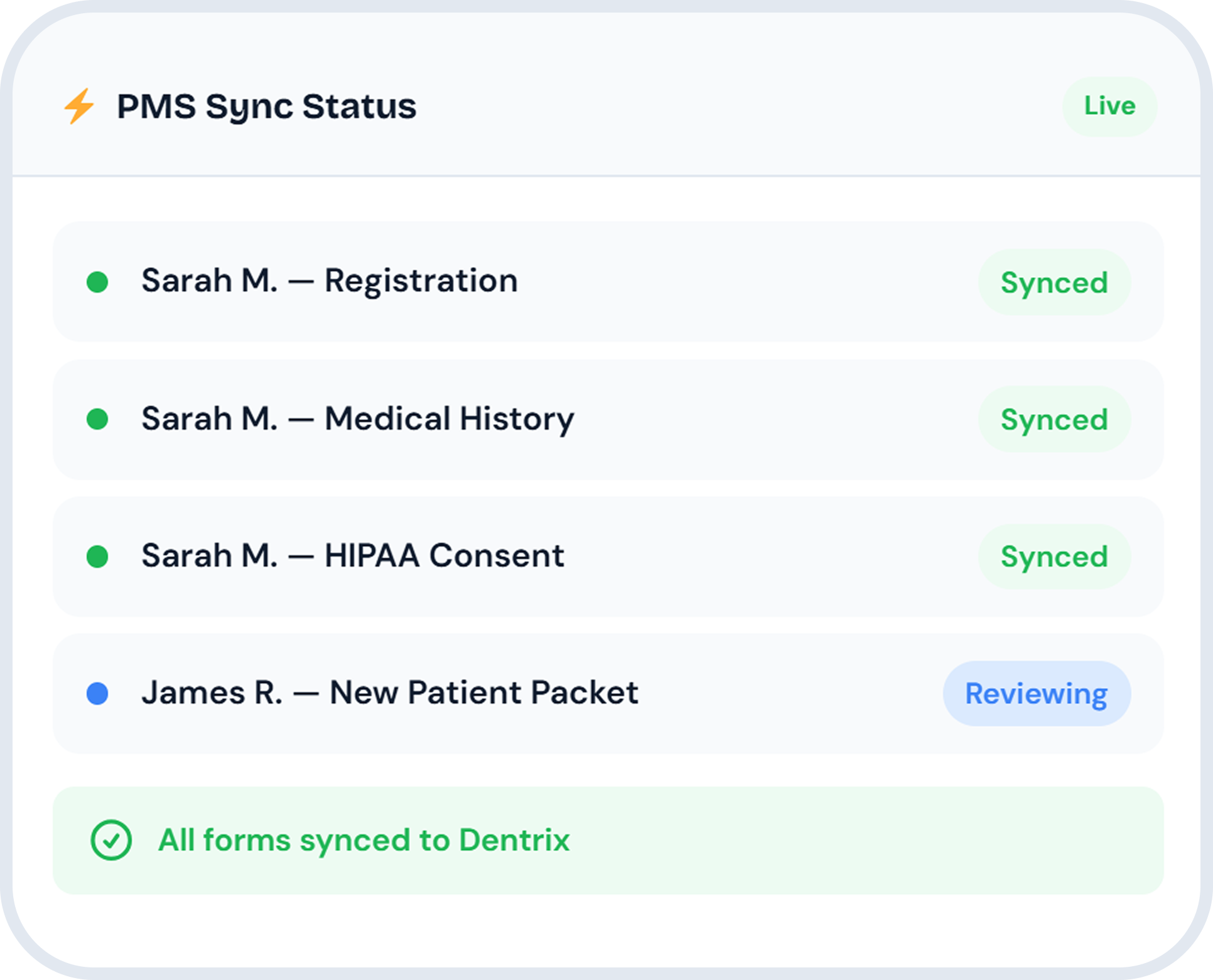| Auto-sync into Dentrix / Eaglesoft / Open Dental | ||