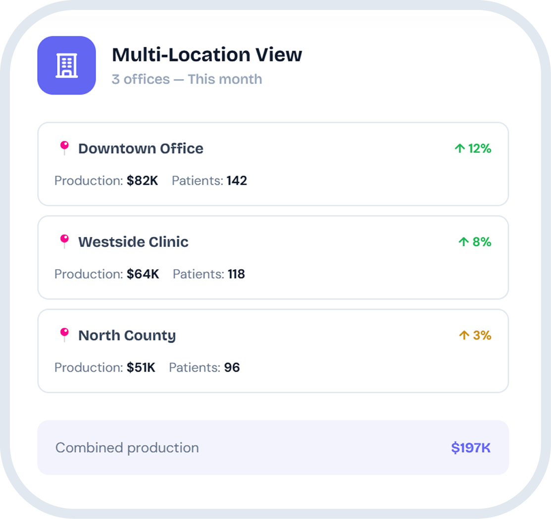 Whether you're scaling from 2 locations to 20, mConsent standardizes operations across every office. One dashboard, one training process, one support team — with the flexibility to handle different PMS systems across locations.