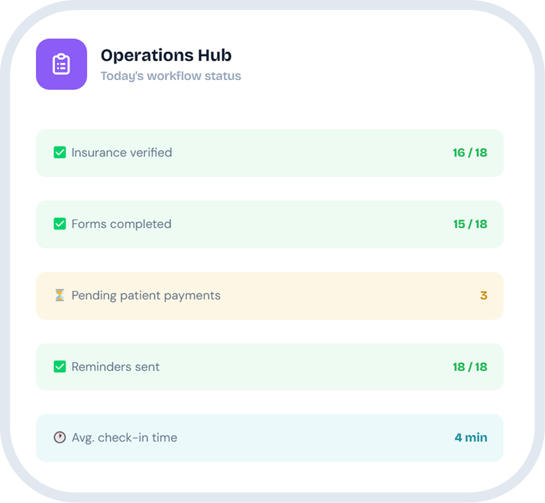 mConsent replaces repetitive tasks—paper intake, confirmations, follow-ups, insurance checks, and payment links—with automated workflows and clear visibility for the whole team.