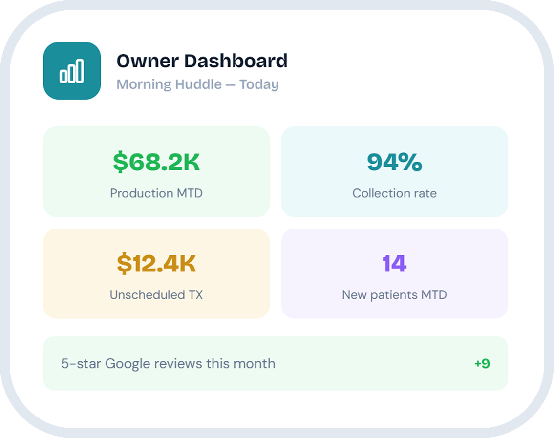 Dental software that keeps revenue, schedules, and collections visible — daily.
